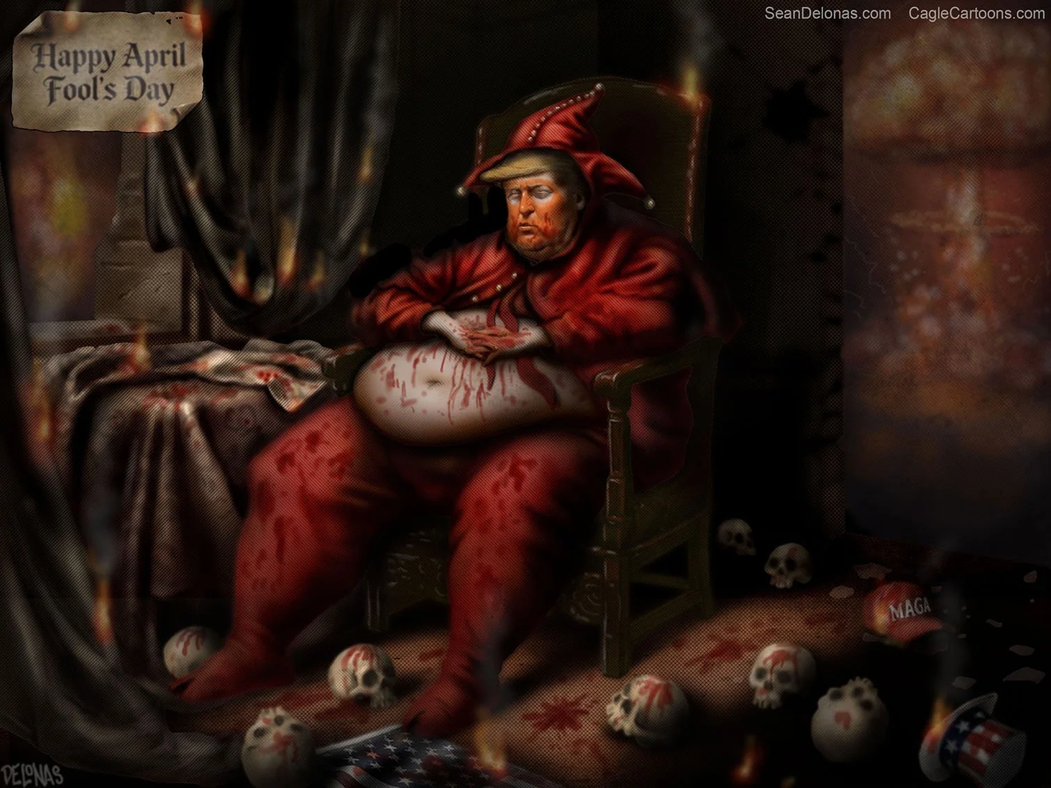 Regarding the cartoon, “Fools’” is usually plural for April Fools’ Day. However, the cartoon uses the singular “Fool’s” because the cartoon specifically centers on Trump. The vibrant ball in the background was substituted with the smoke and flames of the Iran war. To prevent the smoke and fire’s warm tones from competing with the costume’s red, the chroma was reduced to the lowest possible level. I unsuccesfully attempted to transform the letter about the Smolensk tragedy into a map of Iran. However, due to its diminutive size and an angle that rendered it unreadable, I ultimately decided to leave it as plain paper, mirroring Matejko’s approach with the letter. The ground is covered in blood symbolizing needless war deaths, staining the American flag, a MAGA hat, and Trump himself.